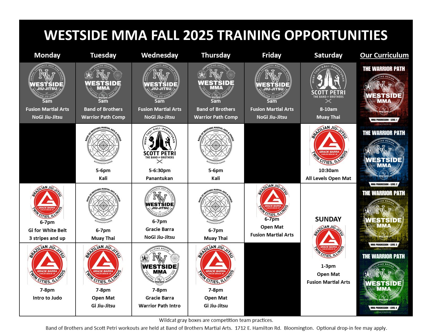 Three gyms. No egos. Our Westside MMA Competition Team practices three mornings per week with NoGi Jiu-Jitsu and three mornings per week for Filipino Boxing and Muay Thai. Our Jiu-Jitsu instructors are black and brown belts. Our Muay Thai instructors include an instructor who is a student of the man who brought Muay Thai to the United States, Ajarn Chai.